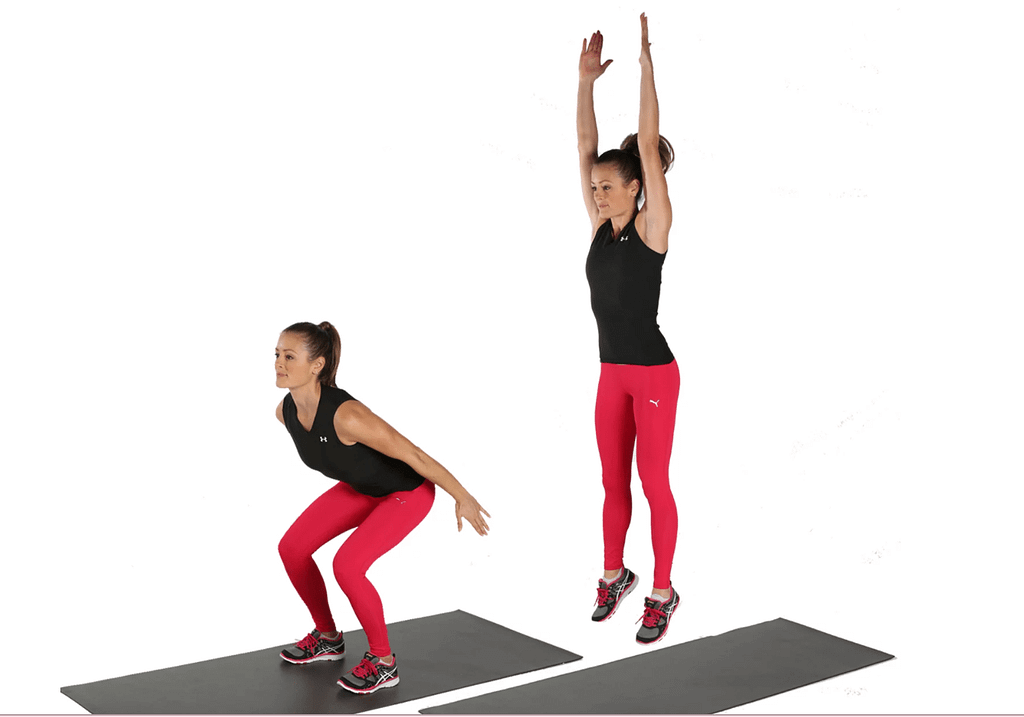 Ca și exercițiul de dinainte, săriturile folosesc și ele la antrenamentul cardiac. Puteți pierde și în greutate făcându-l. Îndoiți genunchii, în timp ce brațele merg către spate. Apoi, săriți, ridicând mâinile drepte, sus. Săriți cât de sus puteți, iar când aterizați, îndoiți genunchii. Nu faceți pauze între sărituri.